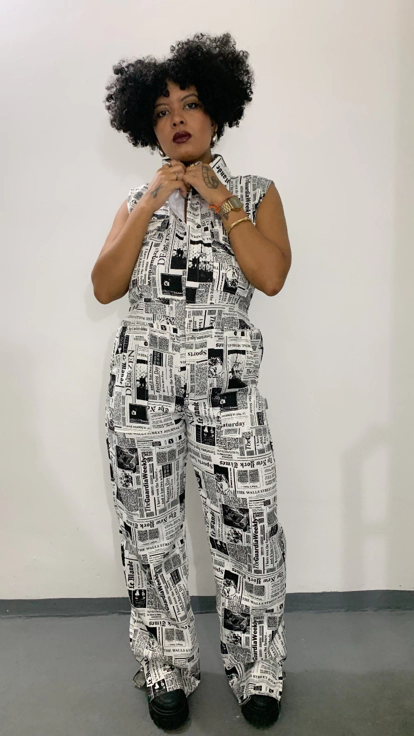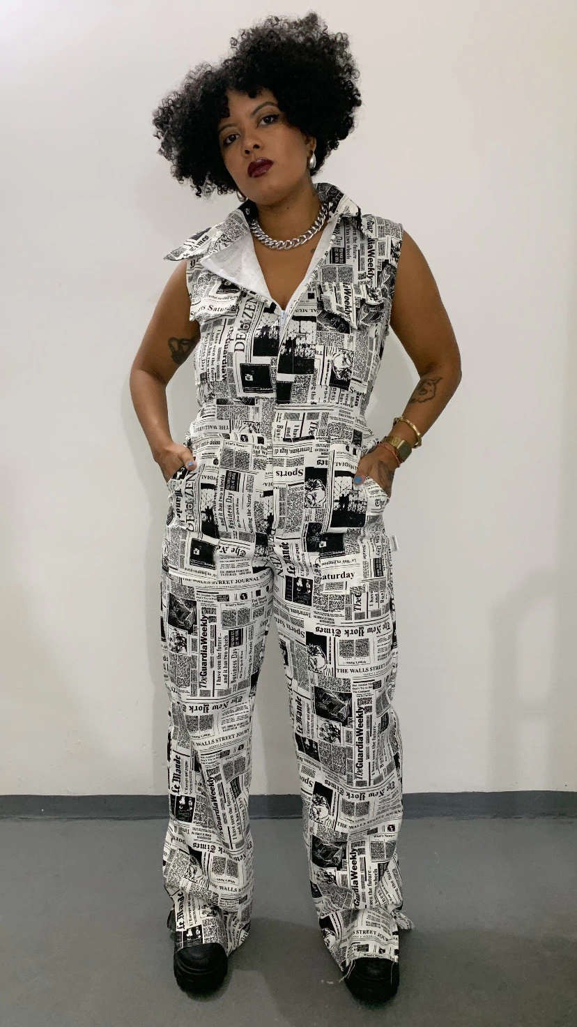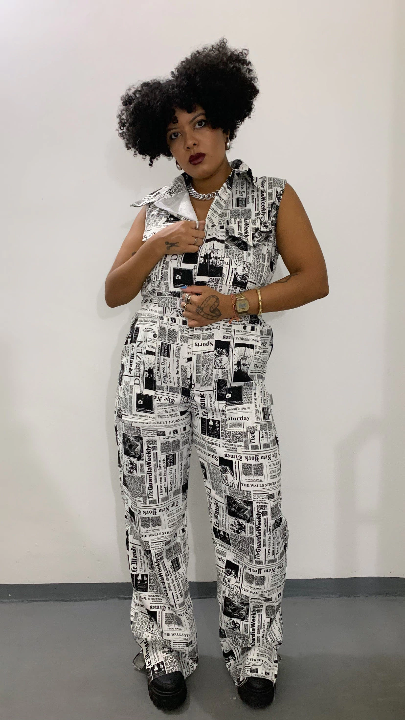 O tecido do macacão no jeans, é uma sarja mais encorpada e na estampa de jornal, é um jacquard. Ambos os tecidos feitos para o dia a dia, usem sem dó!