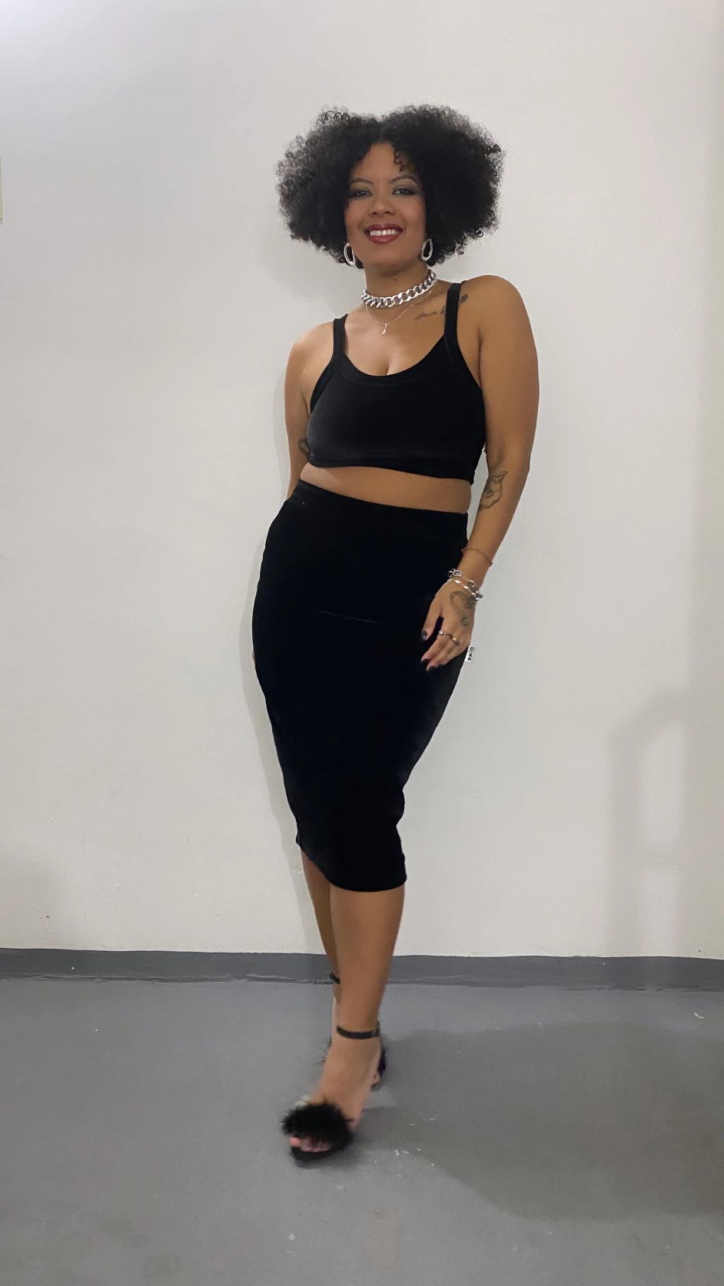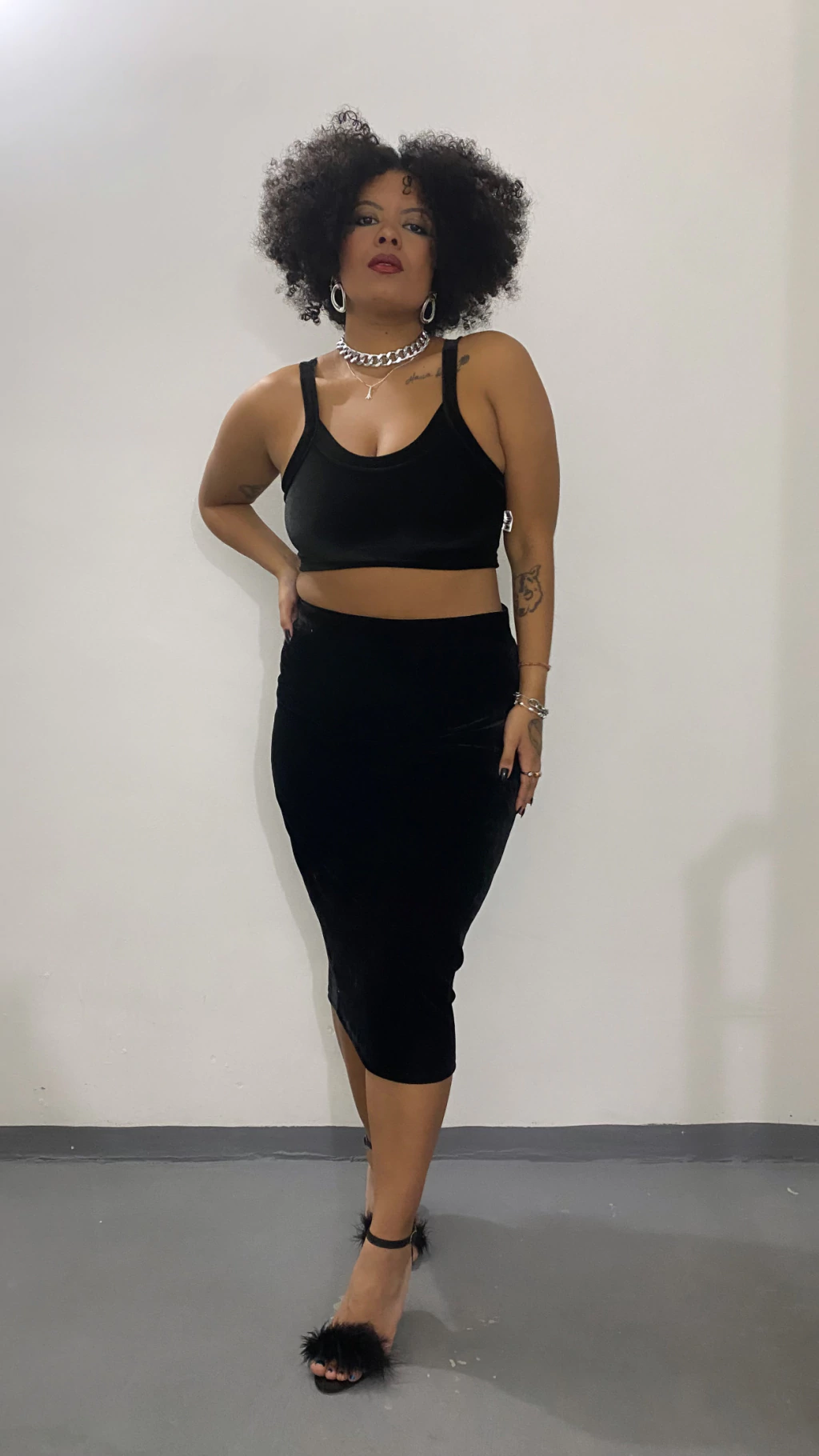Mostra o corpo com elegância e encara de frente.